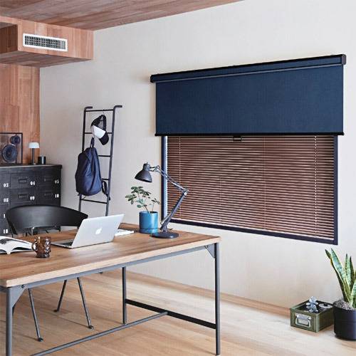 ブラウンのブラインドと、デニム風生地のロールスクリーンを